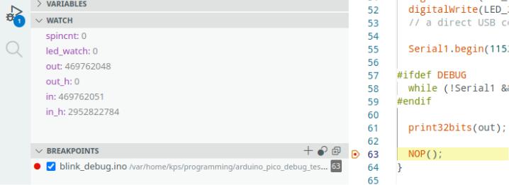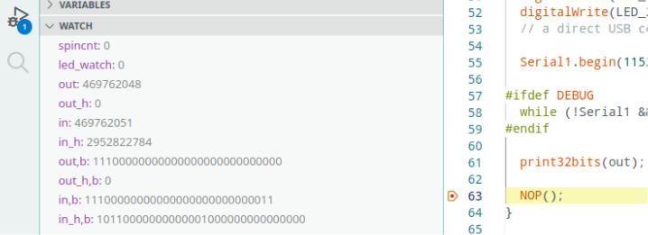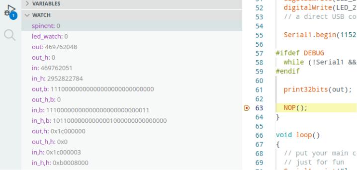 /* using the original blink example enhanced for debugging */ /******************************************************************************/ #include “hardware/regs/sio.h” #include “hardware/structs/sio.h” uint32_t out = sio_hw->gpio_out; // all output states uint32_t in = sio_hw->gpio_in; // all input states uint32_t out_h = sio_hw->gpio_hi_out; uint32_t in_h = sio_hw->gpio_hi_in; /******************************************************************************/ int led_watch; #include “standard_unions.h” #include “pico_display_2_8_pins.h” union WORD_BYTES_BITS out_bits; union WORD_BYTES_BITS in_bits; bool bit_25_out = out_bits.bits.bit25; bool bit_25_in = in_bits.bits.bit25; #define NOP() asm (“nop”) char spinning[] = {‘|’,‘/’,‘-‘,‘\\’,‘|’}; int spincnt = 0; /******************************************************************************/ #define DEBUG long timeoutUSB = millis(); #define USB_TIMEOUT 5000 /******************************************************************************/ #define LED_25 25 void setup() { // put your setup code here, to run once: // initialize digital pin LED_BUILTIN as an output. pinMode(LED_RD, OUTPUT); pinMode(LED_GN, OUTPUT); pinMode(LED_BL, OUTPUT); digitalWrite(LED_RD, HIGH); // 26 digitalWrite(LED_GN, HIGH); // 27 digitalWrite(LED_BL, HIGH); // 28 pinMode(LED_25, OUTPUT); digitalWrite(LED_25, LOW); digitalWrite(LED_25, HIGH); digitalWrite(LED_25, LOW); // a direct USB connection to the PICO uses UART0 Serial1.begin(115200); #ifdef DEBUG while (!Serial1 && (millis() < timeoutUSB + USB_TIMEOUT)); #endif print32bits(out); NOP(); } void loop() { // put your main code here, to run repeatedly: // just for fun Serial1.print(“looping … “); Serial1.println(spinning[spincnt++]); if(spincnt > 3) { spincnt = 0; } digitalWrite(LED_BL, LOW); // turn the LED on digitalWrite(LED_25, HIGH); out_bits.inout_word = sio_hw->gpio_out; in_bits.inout_word = sio_hw->gpio_in; bit_25_out = out_bits.bits.bit25; bit_25_in = in_bits.bits.bit25; #ifdef DEBUG led_watch = digitalRead(LED_BL); out = sio_hw->gpio_out; in = sio_hw->gpio_in; out_h = sio_hw->gpio_hi_out; in_h = sio_hw->gpio_hi_in; Serial1.println(“\nLED is ON”); Serial1.println(“out”); print32bits(out); Serial1.println(“out_h”); print32bits(out_h); Serial1.println(“in”); print32bits(in); Serial1.println(“in_h”); print32bits(in_h); #else led_watch = digitalRead(LED_BL); out = sio_hw->gpio_out; in = sio_hw->gpio_in; out_h = sio_hw->gpio_hi_out; in_h = sio_hw->gpio_hi_in; #endif delay(50); // wait digitalWrite(LED_BL, HIGH); // turn the LED off digitalWrite(LED_25, LOW); out_bits.inout_word = sio_hw->gpio_out; in_bits.inout_word = sio_hw->gpio_in; bit_25_out = out_bits.bits.bit25; bit_25_in = in_bits.bits.bit25; #ifdef DEBUG led_watch = digitalRead(LED_BL); out = sio_hw->gpio_out; in = sio_hw->gpio_in; out_h = sio_hw->gpio_hi_out; in_h = sio_hw->gpio_hi_in; Serial1.println(“\nLED is OFF”); Serial1.println(“out”); print32bits(out); Serial1.println(“out_h”); print32bits(out_h); Serial1.println(“in”); print32bits(in); Serial1.println(“in_h”); print32bits(in_h); #else led_watch = digitalRead(LED_BL); out = sio_hw->gpio_out; in = sio_hw->gpio_in; out_h = sio_hw->gpio_hi_out; in_h = sio_hw->gpio_hi_in; #endif delay(500); // wait } |