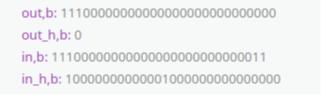 „out,b“ zeigt die Bits, allerdings ohne Führungsnullen. Aber immerhin.