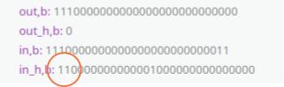 Ich drucke im Monitor exemplarisch vier Register: out, out_h, in, in_h.